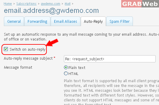 5) Select the check box "Switch on auto-reply"